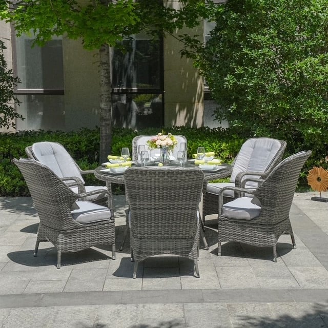 This deluxe dining set with 6 curved chairs offers supreme comfort and sophistication for your garden. Made with the highest quality hand woven rattan.