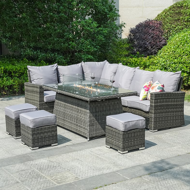 The standout feature of this set is its exquisite rattan table, which includes a large gas fire pit at its centre. This table not only offers ample dining space but also enhances the ambiance with its warming firepit, allowing you to enjoy your garden furniture well into the evening with both light and heat.