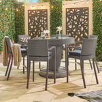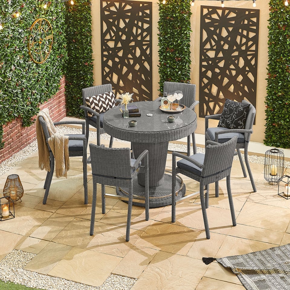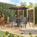 The bar set consists of a round bar table, and 6 tall bar stools, ideal for social gatherings in warm weather.